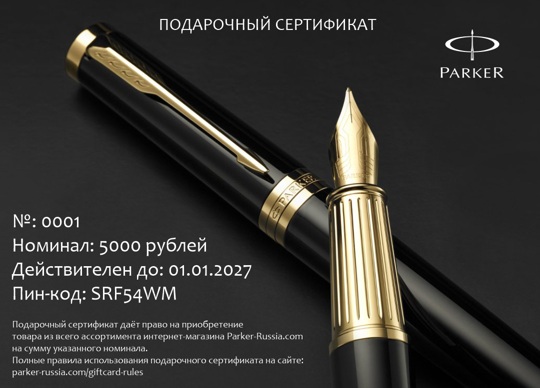 Подарочный сертификат Parker 15000 от официального дилера Parker в Одинцово. Вы можете дополнительно заказать гравировку, которая подчеркнет Вашу оригинальность и придаст памятность статусному подарку. Все ручки Паркер поставляются в фирменном футляре.